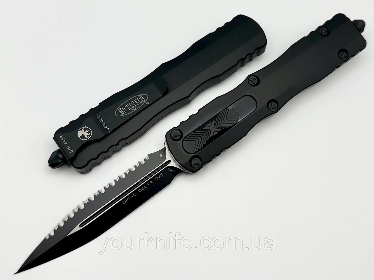 Колодка з авіаційного алюмінію чорного кольору в поєднанні з чорною фурнітурою й чорним клинком має просто чудовий вигляд. Клинок виготовлений із кращої сталі M390. Клинок двогострий, з одного боку плейн, з іншого — серейтор. Дуже люблю такі клинки: максимально практично та красиво. Також є склобій, як у будь-якого шанованого тактика. Але все це можна сказати майже про будь-яку модель Microtech. Я хочу приділити більше уваги особливостям Microtech Dirac Delta.